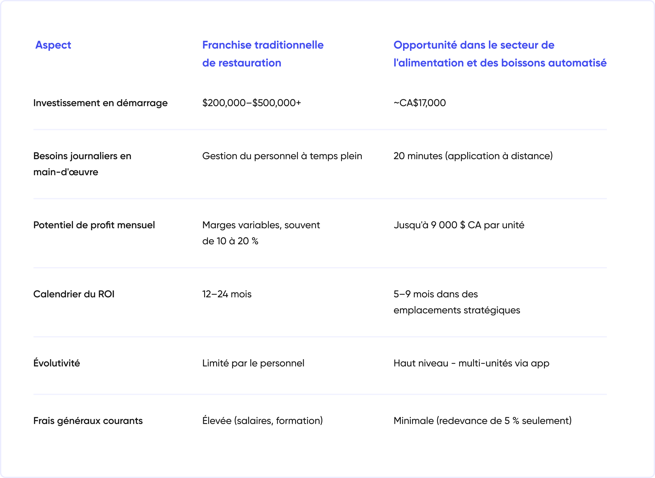 Ce tableau illustre pourquoi les opportunités de franchises de vente au détail sans personnel attirent d'importants capitaux en 2026.