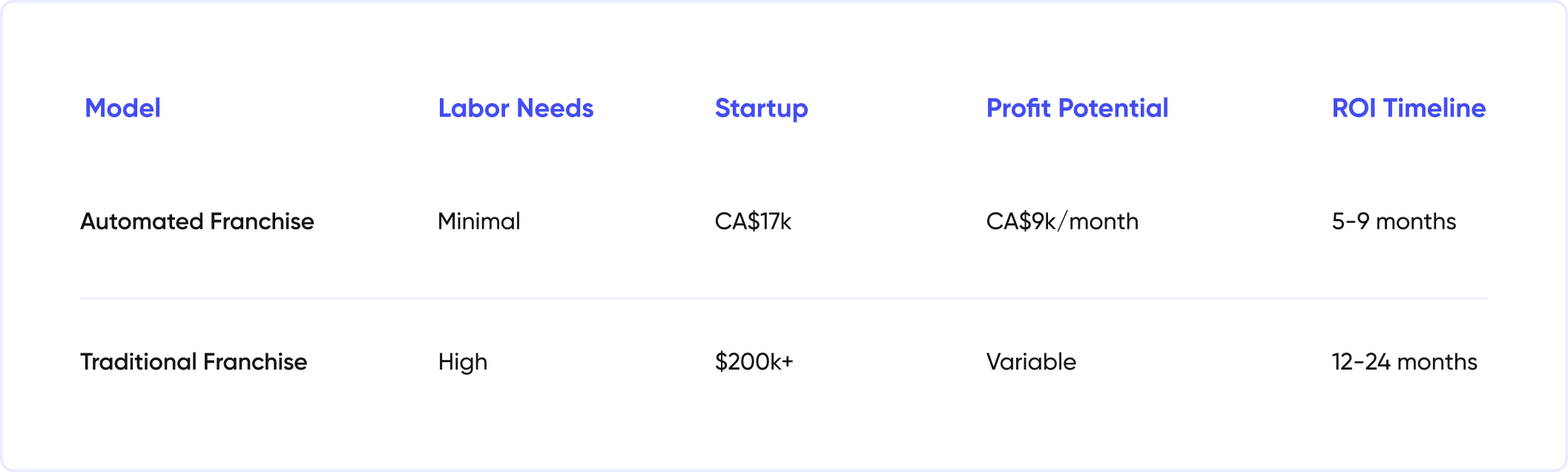 Low labor models cut expenses while boosting margins, with automation handling 90% of tasks. Startups at CA$17,000 yield 38.7% cash-on-cash returns for financed investments.