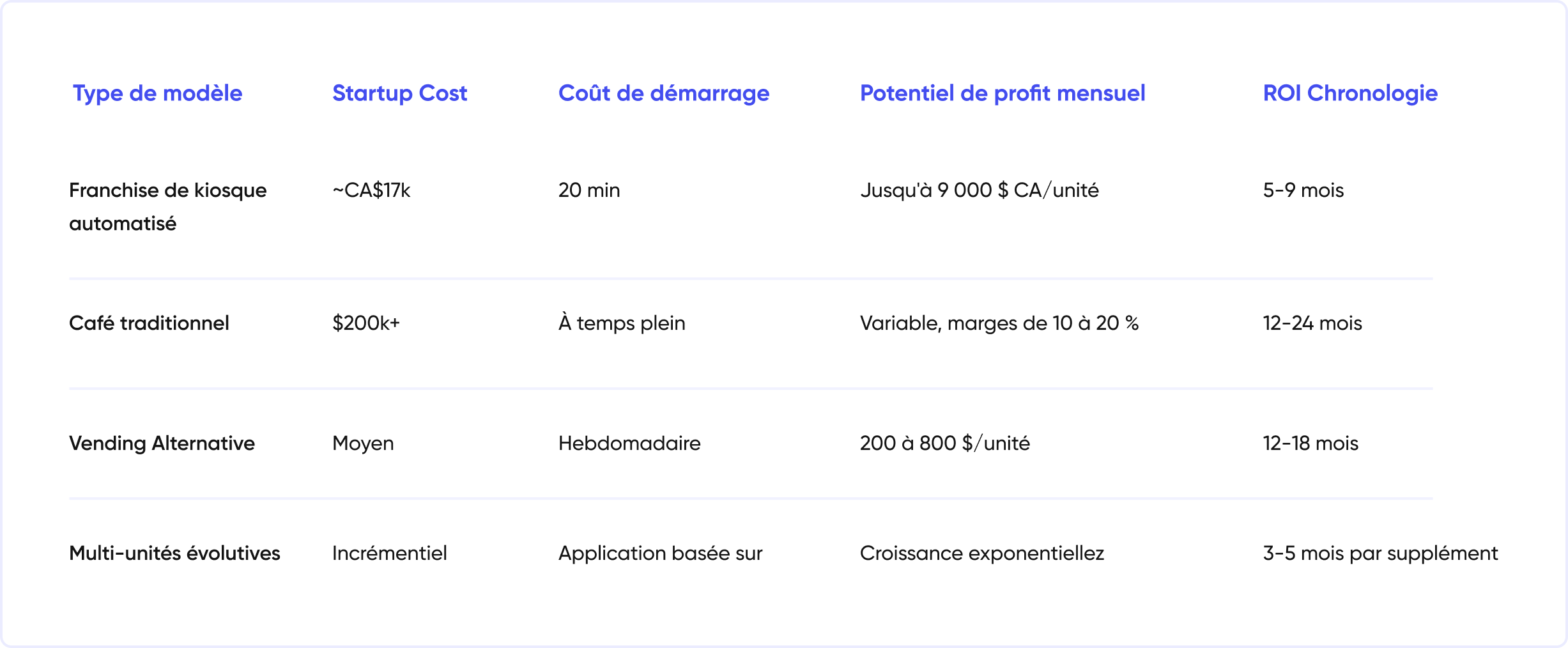 Les revenus augmentent de manière évolutive en dupliquant les unités performantes dans différentes métropoles, grâce à une technologie centralisée de supervision. Commencez par un emplacement à fort trafic, puis étendez-vous à d'autres villes comme Vancouver ou Calgary, en atteignant un rendement net de 20 à 25 % avec des configurations semi-passives.