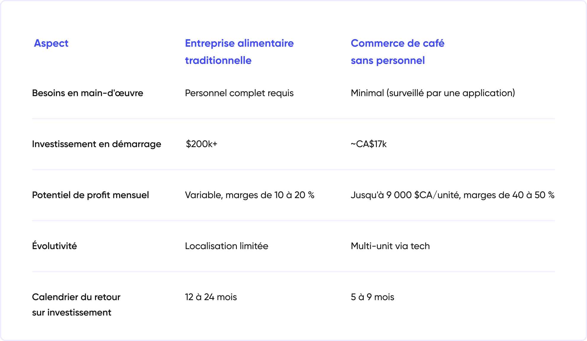 Le secteur du commerce de détail sans personnel transforme l'approche des investisseurs dans le secteur de l'alimentation et des boissons, en passant d'opérations à forte intensité de main-d'œuvre à des systèmes technologiques privilégiant l'efficacité et l'évolutivité. Le marché mondial des terminaux sans personnel devrait passer de 1,73 milliard de dollars en 2025 à 1,91 milliard de dollars en 2026, soit un TCAC de 10,6 %. Les bars à café automatisés, par exemple, sont à l'avant-garde de cette croissance. Forts de notre expérience dans accompagnement de nos partenaires lors de leur expansion, nous avons constaté que ces entreprises génèrent des rendements fiables avec un minimum de supervision quotidienne, ce qui les rend idéales pour les entrepreneurs axés sur une croissance à long terme.