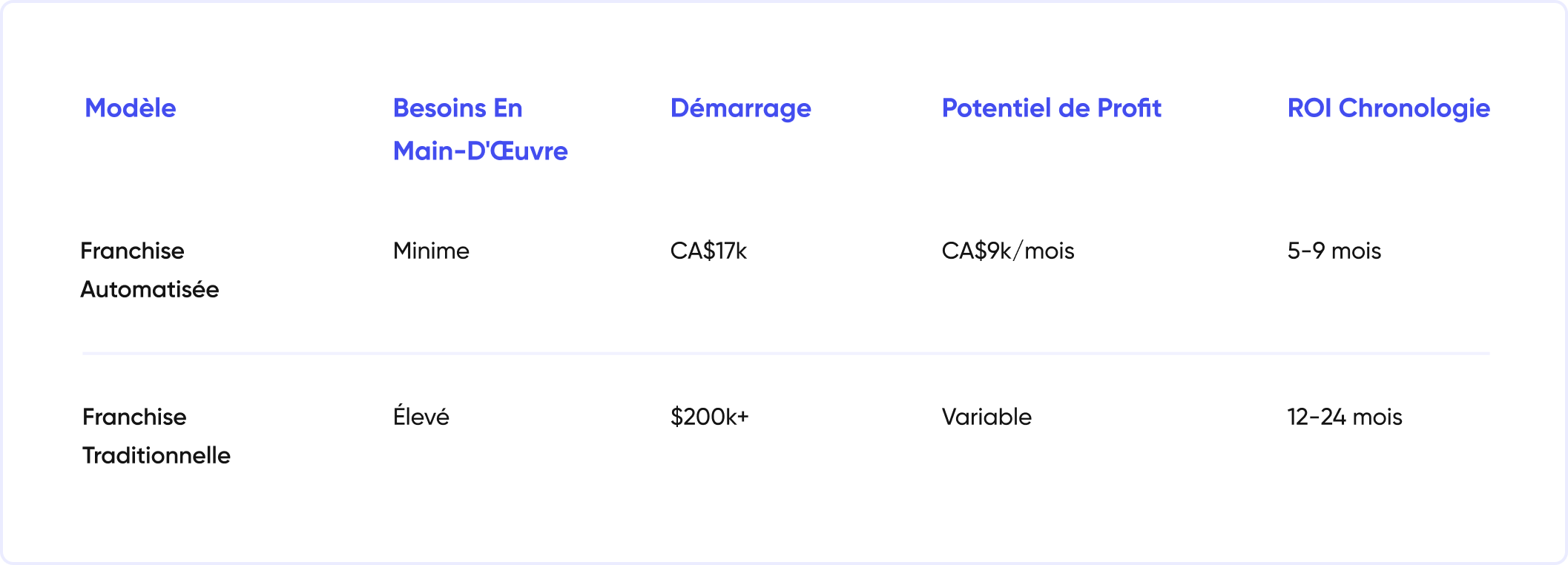 Les modèles de personnel minimal donnent la priorité aux systèmes par rapport aux personnes, en utilisant des applications et l'IoT pour la supervision et en éliminant le besoin d'équipes complètes. Cela est particulièrement utile en 2026, car l'emploi en franchise augmente de 2,4% pour atteindre plus de 9 millions d'emplois, mais les pénuries persistent dans les secteurs à bas salaires. Les investisseurs bénéficient d'une masse salariale réduite—souvent de 10 à 20% du chiffre d'affaires contre 30 à 50% pour les opérations avec du personnel—libérant du capital pour la croissance.
