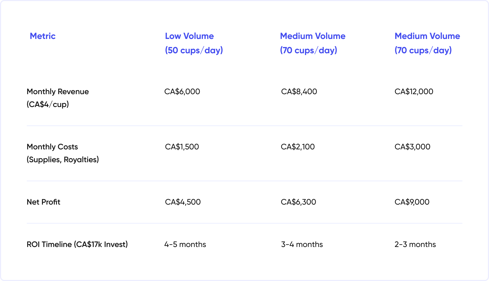 Le modèle économique repose sur des principes simples : des marges élevées par transaction, amplifiées par le volume. Avec un profit de 3 $ CA par tasse (après déduction des coûts), une unité vendant 70 tasses par jour génère 6 300 $ CA par mois. Le retour sur investissement est souvent atteint en 5 à 9 mois, avec un rendement annuel de 15 à 40 %, supérieur à celui de nombreux investissements traditionnels.