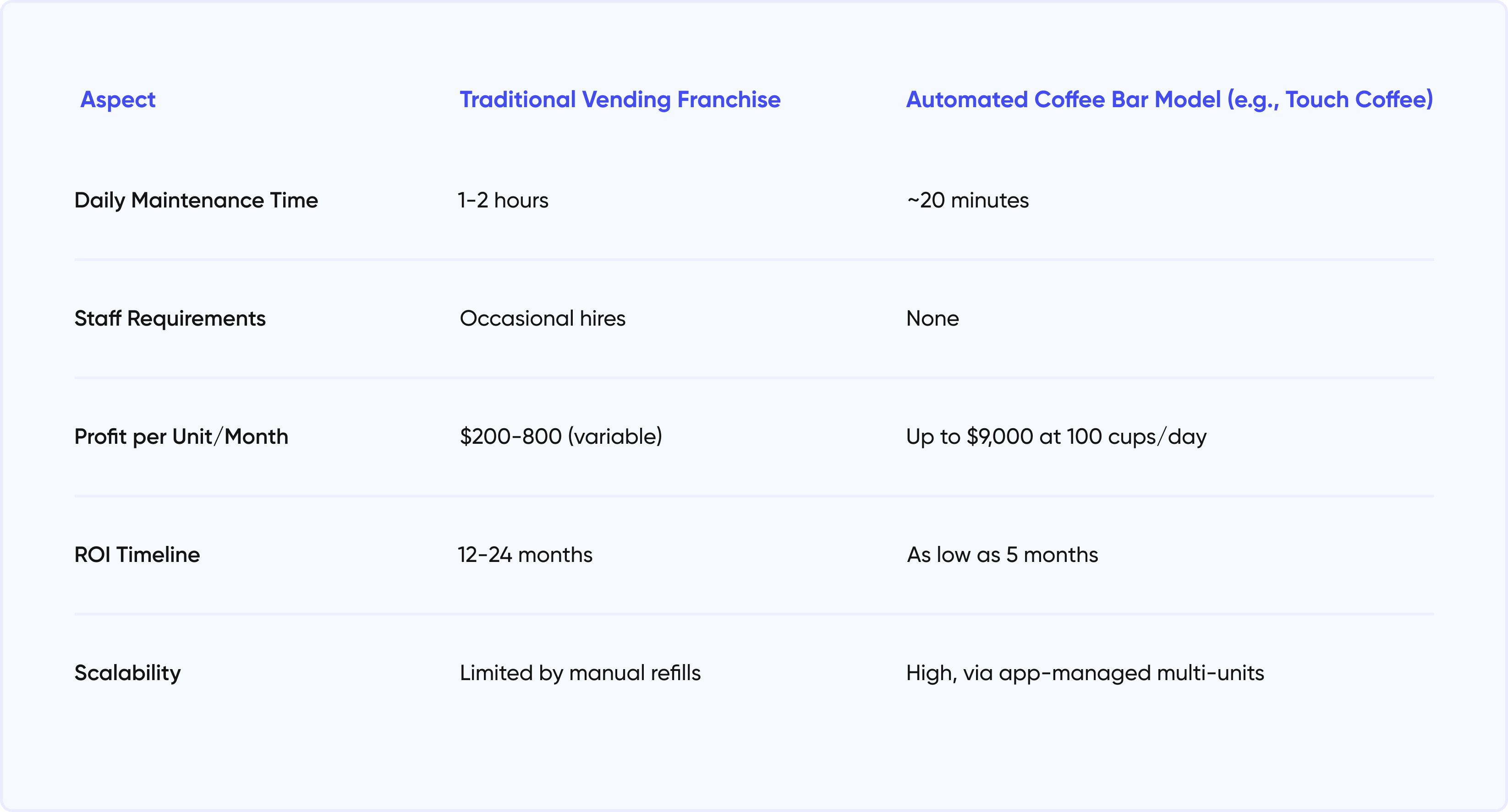 This data-driven model ensures investors see tangible value, making it a standout in the semi-passive space. Curious about your personalized ROI? Use our profit calculator on the Touch Coffee site to get started.