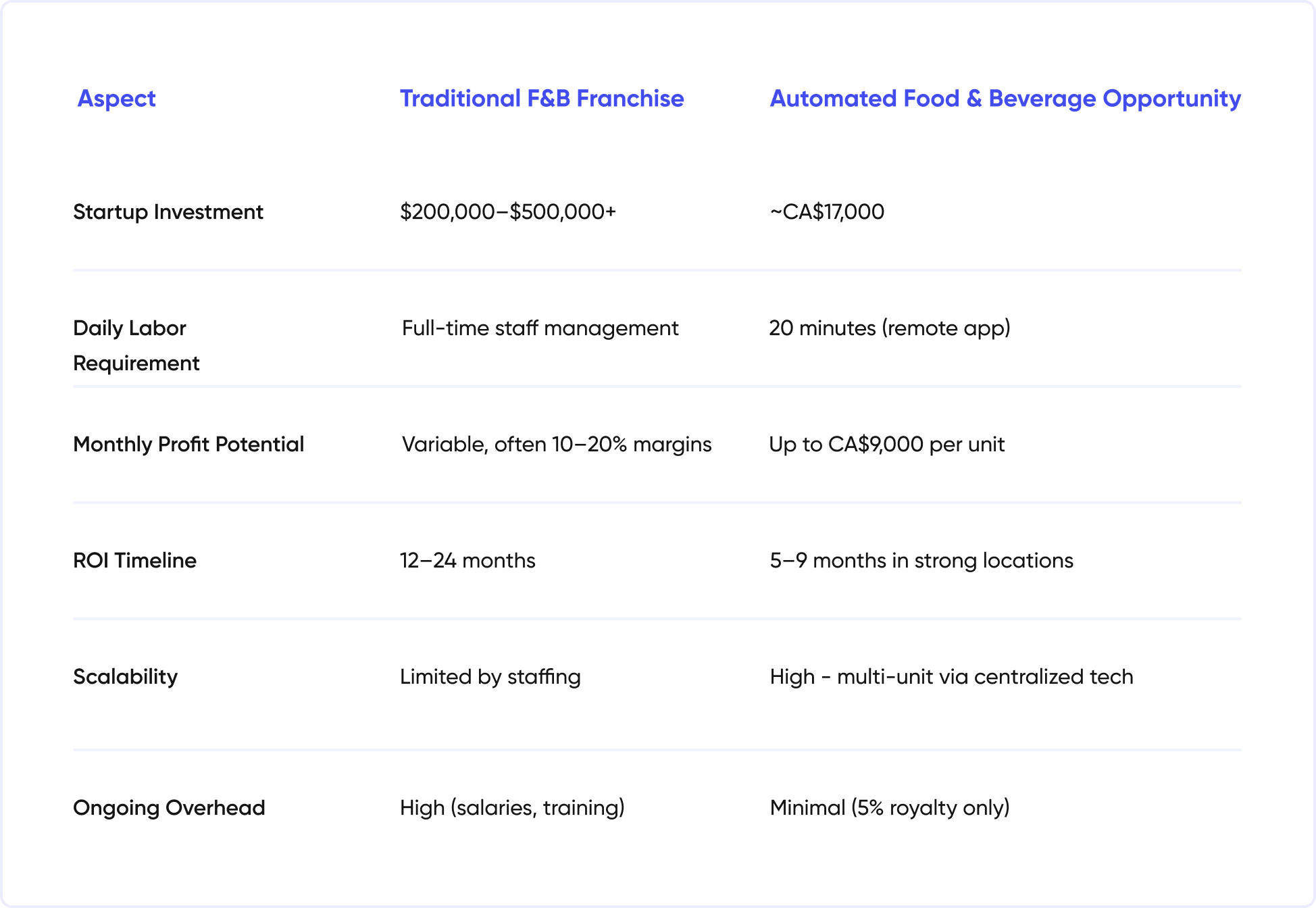 Conventional food and beverage franchises often demand significant upfront capital - frequently exceeding $200,000 - for build-outs, equipment, and initial staffing. Ongoing labor costs, training, scheduling, and turnover further erode margins, typically leaving owners working full-time just to maintain operations. In contrast, modern investors are seeking models where expansion doesn’t require proportional increases in time or personnel.