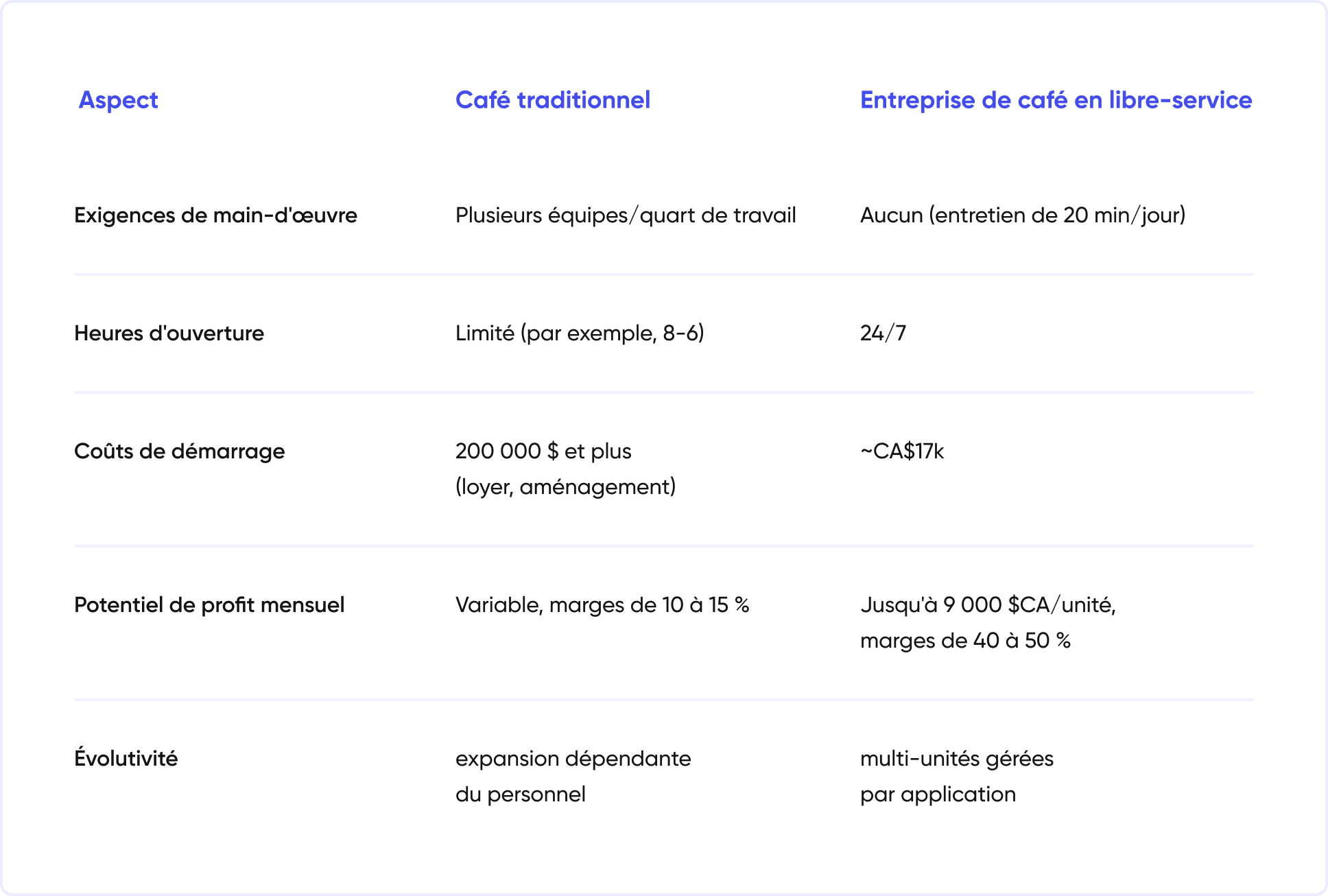 Ce tableau met en évidence pourquoi l'automatisation remplace les cafés traditionnels pour les investisseurs soucieux d'efficacité.